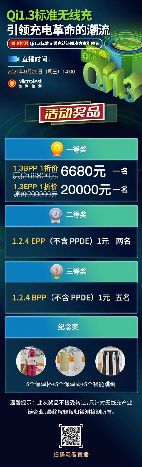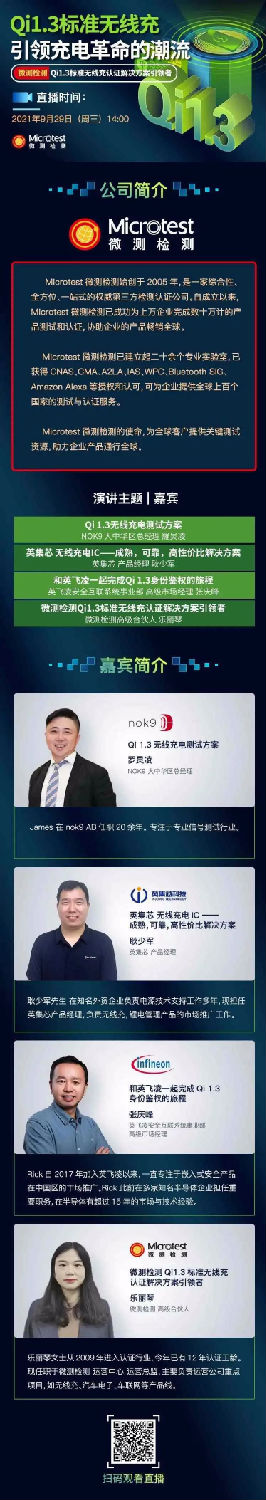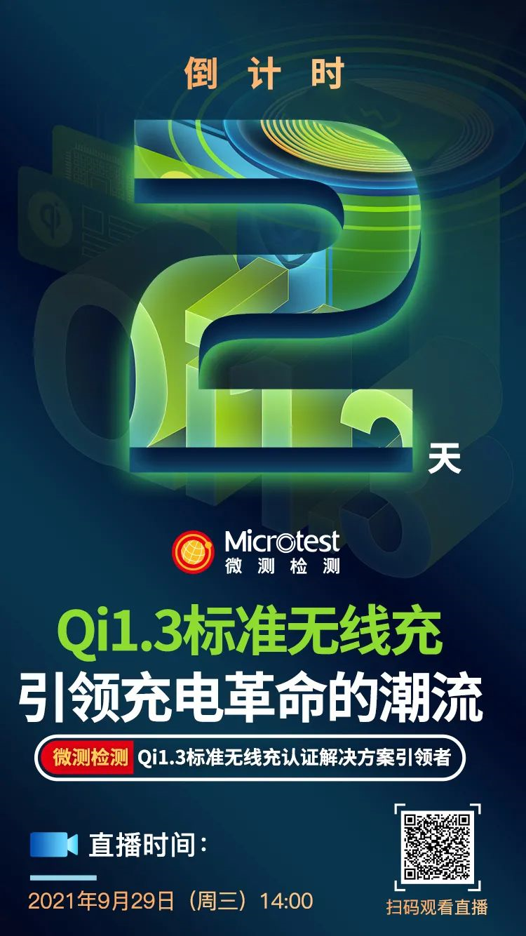 微測(cè)檢測(cè)將于2021年9月29日14:00進(jìn)行《Qi1.3標(biāo)準(zhǔn)無(wú)線充引領(lǐng)充電革命的潮流》線上直播,直播中有多位嘉賓進(jìn)行演講,為您介紹Qi 1.3標(biāo)準(zhǔn)的測(cè)試、鑒權(quán)、解決方案及認(rèn)證,是無(wú)線充電從業(yè)者不可或缺的重要直播,趕快預(yù)約報(bào)名參加吧。