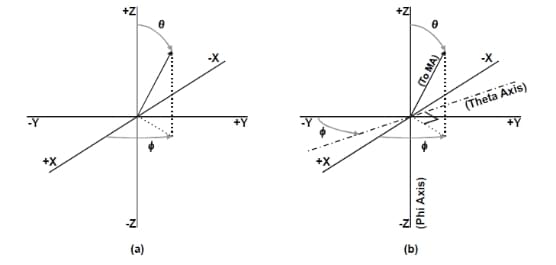 使用大圓切法的系統(tǒng)被稱為組合軸系統(tǒng),兩個旋轉軸相互結合在一起,是在Theta軸定位器基礎之上加裝Phi軸定位器,測量天線固定不動,移動臺在兩個正交軸上按照一定的順序旋轉。