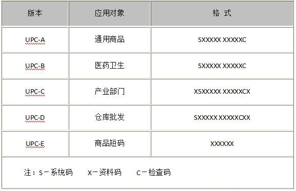 UPC碼(Universal Product Code)是最早大規(guī)模應(yīng)用的條碼,其特性是一種長度固定、連續(xù)性的條碼,目前主要在美國和加拿大使用,由於其應(yīng)用范圍廣泛,故又被稱萬用條碼。UPC碼僅可用來表示數(shù)字,故其字碼集為數(shù)字0~9。UPC碼共有A、B、C、D、E等五種版本,各版本的UPC碼格式與應(yīng)用對象如表 2.1所示。