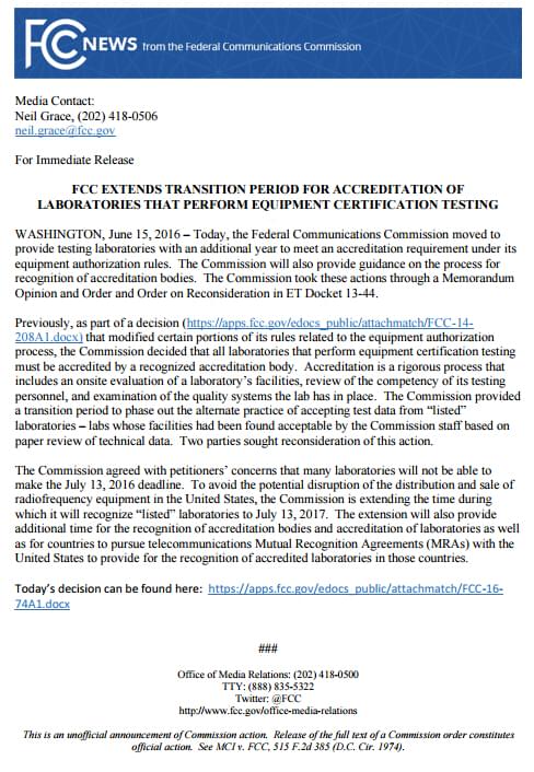 2016年6月15日,美國聯(lián)邦通訊委員會(FCC)發(fā)布了重磅消息,將繼續(xù)接受listed實驗室(主要指中國大陸的)出具的檢測報告申請F(tuán)CCID,延長期為一年,直到2017年7月13日,對于中美之間暫無MRA的中國大陸實驗室以及國內(nèi)的制造企業(yè)來講,仍有1年的緩沖期進(jìn)行調(diào)整和適應(yīng)。