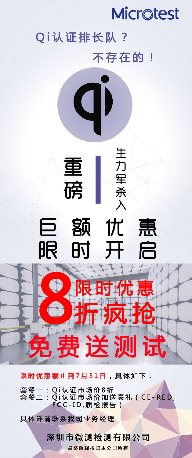 當(dāng)前位置:首頁11 » 微測檢測資訊中心 » 行業(yè)新聞 » 時下最火的Qi認(rèn)證,微測檢測7月推出8折巨額優(yōu)惠,不能再錯過?。?!