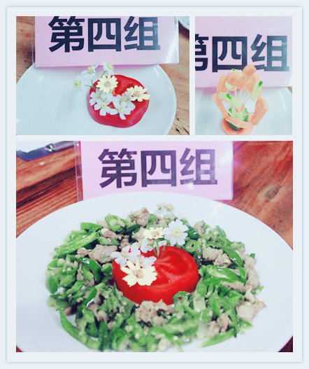 做飯的過程中,波折不斷。本來(lái)我們準(zhǔn)備將Danie的水煮魚作為此次廚神爭(zhēng)霸的競(jìng)選菜肴,但是因?yàn)闀r(shí)間原因,只能將小炒肉(青椒肉絲)作為競(jìng)選菜肴。正在我忙碌的準(zhǔn)備擺盤的時(shí)候,Andy與Amy將她們精心雕琢的裝飾物拿了上來(lái)。 看到的一剎那,我的內(nèi)心“瞬間被點(diǎn)燃了希望”。