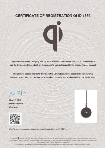 在通過Qi認(rèn)證之后,那么恭喜,您就可以可以獲得專屬證書。并且可以在全球進(jìn)行產(chǎn)品的銷售了。并且在證書上會(huì)體現(xiàn)產(chǎn)品的品牌、型號(hào)信息,如圖: