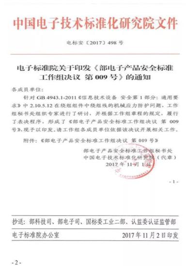 經(jīng)工信部電子產(chǎn)品安全標(biāo)準(zhǔn)工作組專家討論和投票表決,009號(hào)決議于2017年11月1日正式發(fā)布,現(xiàn)公布如下: