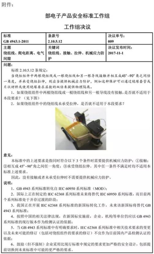 截至發(fā)文日(2017年11月14日),工作組共發(fā)布工作組決議9項(xiàng),與GB 4943.1-2011《信息技術(shù)設(shè)備 安全 第1部分:通用要求》和GB 8898-2011《音頻、視頻及類似電子設(shè)備 安全要求》及其上一版本相關(guān),部分決議已在本公眾號(hào)發(fā)布,詳見(jiàn)文末鏈接,剩余決議將陸續(xù)在本公眾號(hào)發(fā)布。