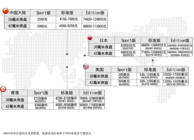 至于大家最關(guān)心的價(jià)格方面,這里為大家梳理出了大家最為關(guān)心的中國(guó)大陸、中國(guó)香港、美國(guó)以及日本這四個(gè)國(guó)家和地區(qū)的價(jià)格明細(xì)對(duì)照。綜合來(lái)看,中國(guó)香港地區(qū)的發(fā)售價(jià)格依然具有優(yōu)勢(shì)。(注:所有價(jià)格均為蘋(píng)果官網(wǎng)顯示的價(jià)格,其中美國(guó)、日本Apple Watch的價(jià)格為稅前價(jià)格。)
