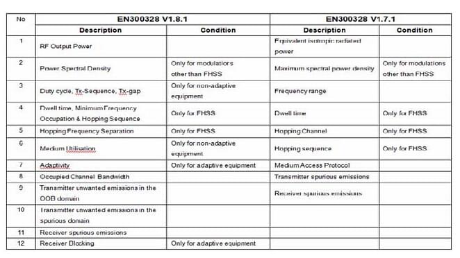 早于2012年發(fā)布的ETSI EN 300 328 V1.8.1 的正式版本,新年1月1日后正式強(qiáng)制施行了。歐洲電信標(biāo)準(zhǔn)協(xié)會(huì)(ETSI)宣布舊版本標(biāo)準(zhǔn)ETSI EN 300 328 V1.7.1失效。新標(biāo)準(zhǔn)的詳細(xì)內(nèi)容如下: