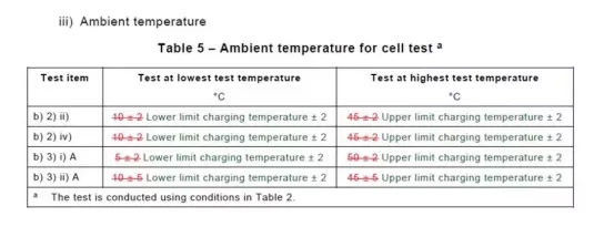 2021年07月15日,IEC網(wǎng)站公布了IEC62133-2:2017標(biāo)準(zhǔn)的升級(jí)版,即2021版。1、更新后的標(biāo)準(zhǔn)修正了7.1.2 章節(jié)中關(guān)于電芯恒溫充電的擱置時(shí)間,將擱置時(shí)間由1h and 4h respectively 修正為1h to 4h,充電方式由恒壓修正為先恒流充電再恒壓充電。2、7.3.5章節(jié)擠壓測(cè)試,更新后的標(biāo)準(zhǔn)刪除了原標(biāo)準(zhǔn)中上限充電溫度的描述, 新標(biāo)準(zhǔn)明確了上、下限充電溫度都需要測(cè)試。3、7.3.6章節(jié)過充測(cè)試,修正測(cè)試要求的描述為:如果電池中帶有充電保護(hù)電路,應(yīng)該能夠保護(hù)電芯防止起火或爆炸。4、7.3.9章節(jié)強(qiáng)制內(nèi)部短路測(cè)試,修正了測(cè)試溫度的描述,由原來的10℃/45℃修改為按照制造商宣稱的充電溫度下限/上限來處理。如需了解更多認(rèn)證知識(shí),歡迎與我聯(lián)系,服務(wù)熱線:131-4343-1439(微信同號(hào))
