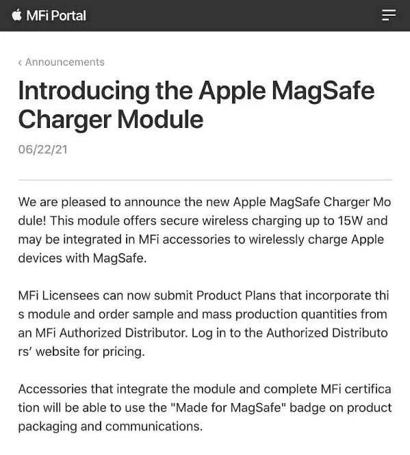 蘋果已于6月22號(hào)發(fā)布公告,開放MagSafe磁吸無線充模塊授權(quán)給第三方MFi會(huì)員企業(yè),會(huì)員企業(yè)可以向蘋果提交MagSafe充電模組的產(chǎn)品計(jì)劃并完成 Made for MagSafe認(rèn)證。