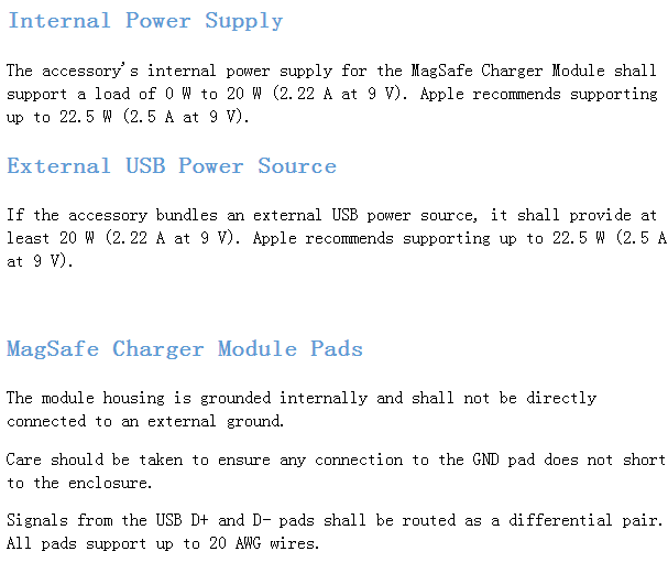 集成MagSafe充電器模塊配件的電源提供方式及功率要求