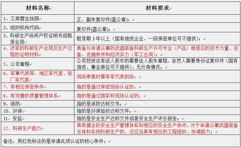 7、有與申請(qǐng)從事的武器裝備科研生產(chǎn)活動(dòng)相適應(yīng)的保密資格。注:具體內(nèi)容請(qǐng)參考《武器裝備科研生產(chǎn)許可實(shí)施辦法》、《武器裝備科研生產(chǎn)許可管理?xiàng)l例》。